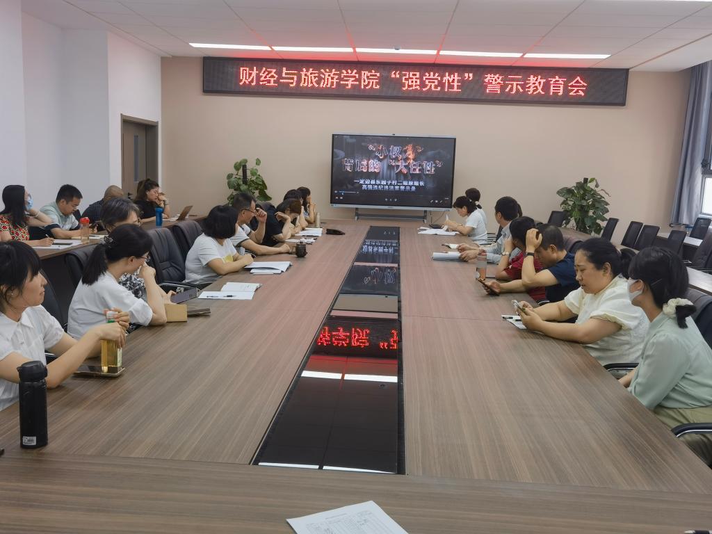 为进一步推动学习贯彻习近平新时代中国特色社会主义思想主题教育,强化党风廉政教育,筑牢廉洁自律思想防线,增强党员干部规矩意识和纪律意识,引导广大党员干部讲规矩、守纪律、知敬畏、存戒惧,营造“清正廉洁,作风优良”的良好工作氛围,持续深化纪律作风建设。6月27日下午,财经与旅游学院全体教师开展“强党性”警示教育会。