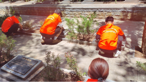 在烈士陵园的烈士墓区,实践团队员们化身为志愿者,清扫烈士碑上的污垢和尘土,在擦除烈士碑上的污垢时,实践团队员可以近距离通过碑上的文字介绍感受革命先烈为革命战争奋不顾身、抛头颅、洒热血的精神。