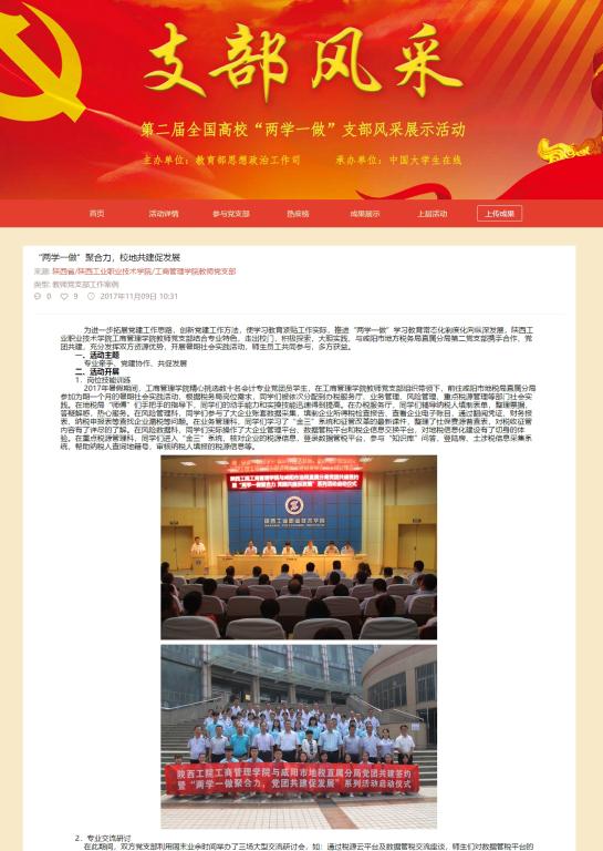 近日,由教育部思政司主办的第二届全国高校“两学一做”支部风采展示活动在中国大学生在线网站进行集中展示,全国共有2860所高校的3688个党支部参与其中。乐游棋牌工商管理学院党总支教师党支部的《“两学一做”聚合力,校地共建促发展》案例光荣入选参评。