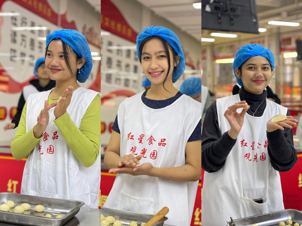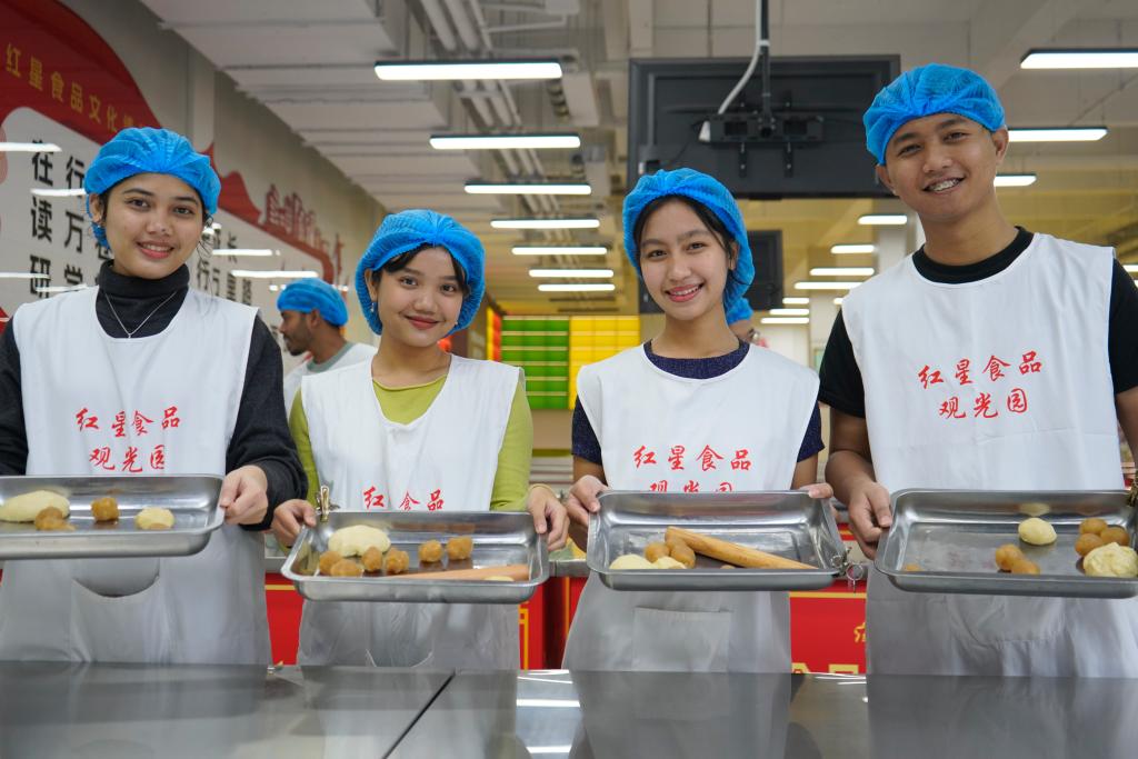 首先,留学生同学在红星食品文化博物馆了解红星食品企业文化,参观生产流水线。第二站,同学们来到研学教室,体验红星软香酥的手工制作过程,大家了解了糕点使用的原料,并在老师的讲解下按步骤制作。同学们纷纷带上帽子、手套、隔离衣裤、鞋套,严实的武装,为的是保证制作糕点过程的卫生性和安全性。“做人要凭良心,产品要凭标准”,红星软香酥奉行诚信原则,把好安全生产关卡,严格要求食品卫生,重视用户服务体验。最后一站,大家拿着号码牌领取自己制作的软香酥。