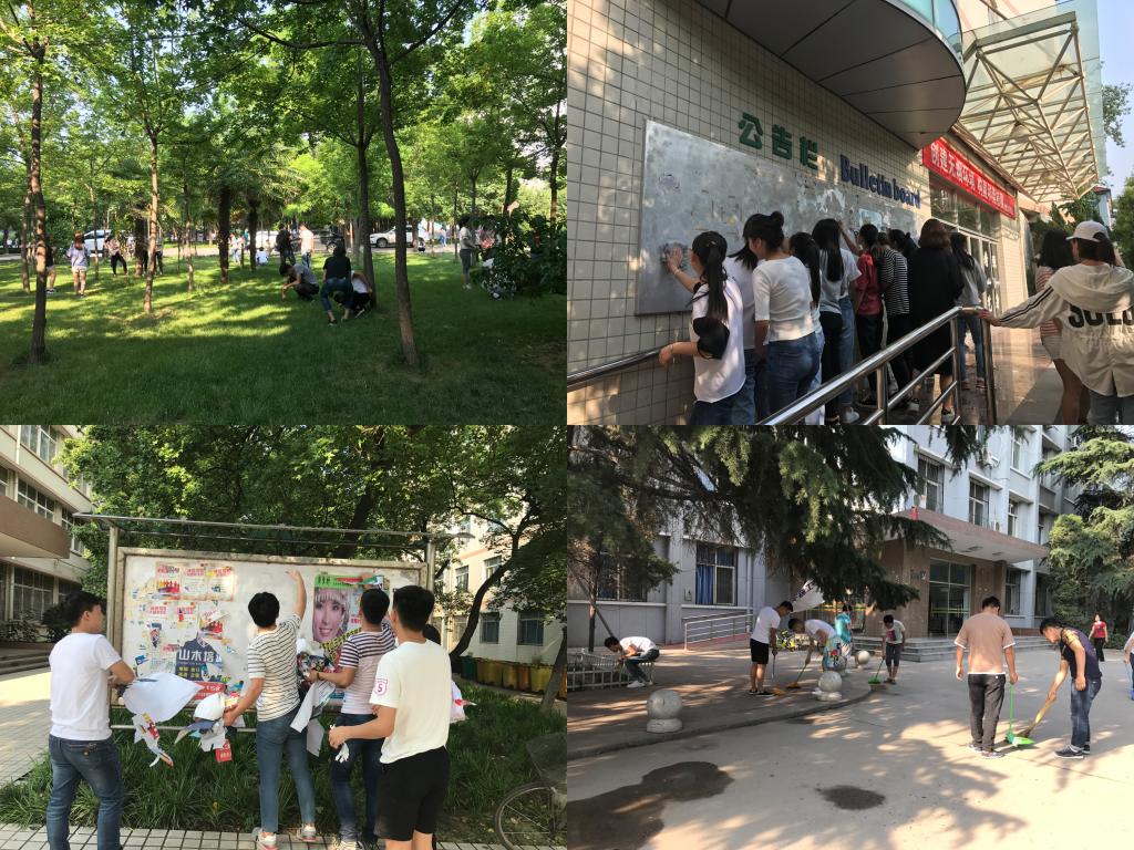 5月16日到19日,各二级学院组织学生对教学楼及周边张贴的小广告、烟头和杂物等进行了清理。19日下午,学生处组织人员对各二级学院活动开展情况进行集中检查,将检查结果及时反馈给二级学院,对清理不彻底区域督促尽快清理。