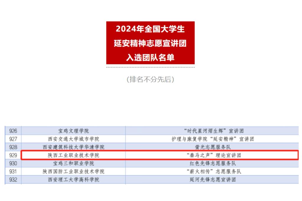我校志愿宣讲团经自主申请、学校推荐、主办单位遴选等环节,马克思主义学院“秦马之声”理论宣讲团成功入选2024年全国大学生延安精神志愿宣讲团;材料工程学院“红色引领 匠心筑梦”志愿宣讲团成功入选2024年全国大学生“两弹一星”精神志愿宣讲团;汽车工程学院“井冈山上育希望 时代青年勇前行”志愿宣讲团成功入选2024年全国大学生井冈山精神志愿宣讲团。