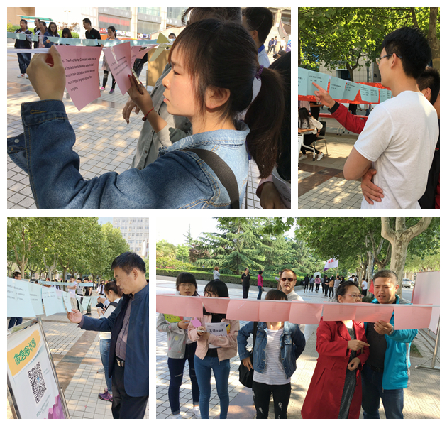 本次活动为参与的师生准备了100道知识竞答题,内容涵盖文学、计算机、英语、常识、图书馆资源使用等各类知识。前来答题的同学有的独自思考、有的三两讨论、有的求助网络,在轻松活泼的过程中拓宽了知识面。同学们在答题之余,纷纷在横幅上签下自己的姓名,立志兴读书之风,共创书香校园!