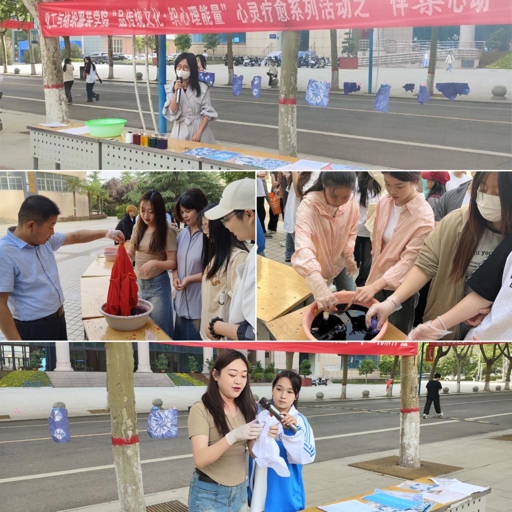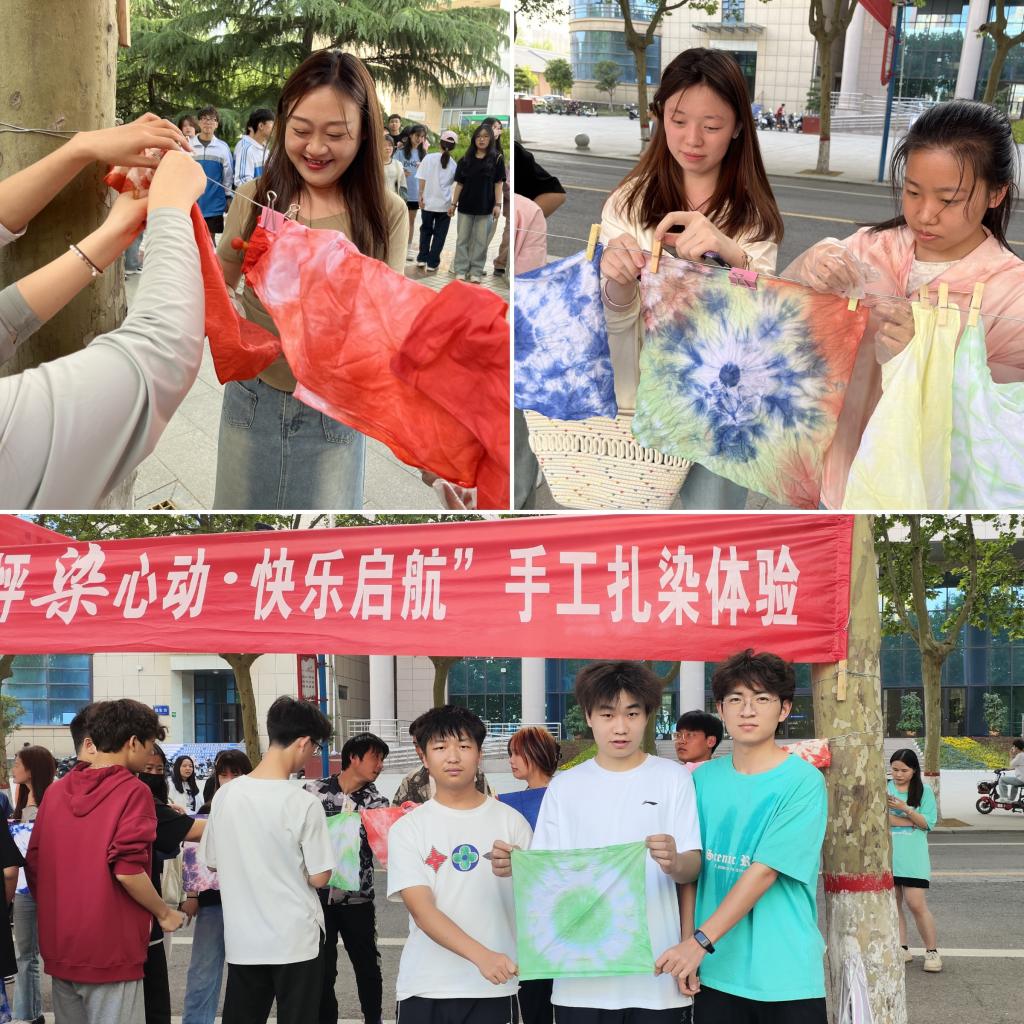染一湖风月,留一锦斑斓。为创新学生心理健康教育内容形式,发挥美育丰富精神、温润心灵作用,有效引导学生自觉学习心理调适方法,培养积极向上的健康心态,落实我校第九届“阳光护航”心理育人宣传季实践活动,4月25日,化工与纺织服装学院阳光心情工作站开展心灵疗愈系列活动之“怦‘染’心动,快乐启航”手工扎染体验活动,引导学生感受非遗文化的同时,疏解情绪,放松身心,学会悦纳自我,汇聚“心”能量。化纺服学院院长刘迪、党总支书记杨修国、服装教研室王晶、心理专干曹淼及近四百名学生共同参与了本次活动。