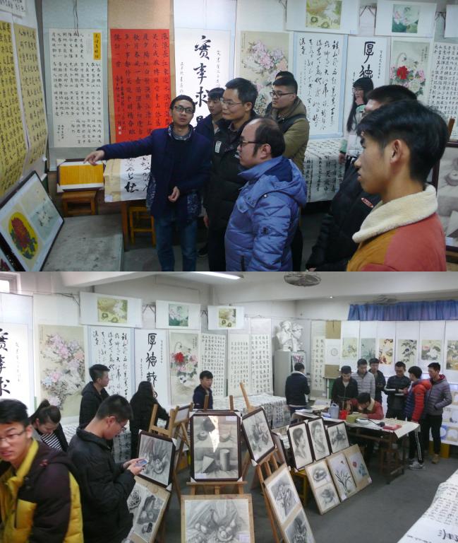 在2017新年来临之际,由学生处主办,大学生艺术团书画社承办的迎新年书画作品展于12月26至28日在明伦餐厅南侧二楼书法绘画鉴赏教室举行,学生处副处长张科海等亲临现场参观指导。