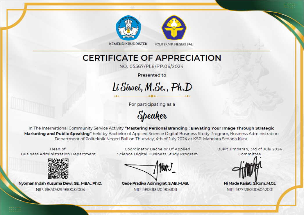 7月4日,应印度尼西亚巴厘理工学院工商管理系邀请,商贸学院电子商务教研室主任李思维在线上参与了其组织的Mastering Personal Branding: Elevating Your lmage Through strategic Marketing and Public speaking国际交流活动,为该校应用科学数字商务专业师生作了题为“Create Value Branding of Marketing”的专题讲座。国际合作与交流处处长、国际教育学院院长秦景俊,商贸与流通学院教师李宗蔚、张庆及印度尼西亚留学生王家丽参与了此次对外线上交流活动。