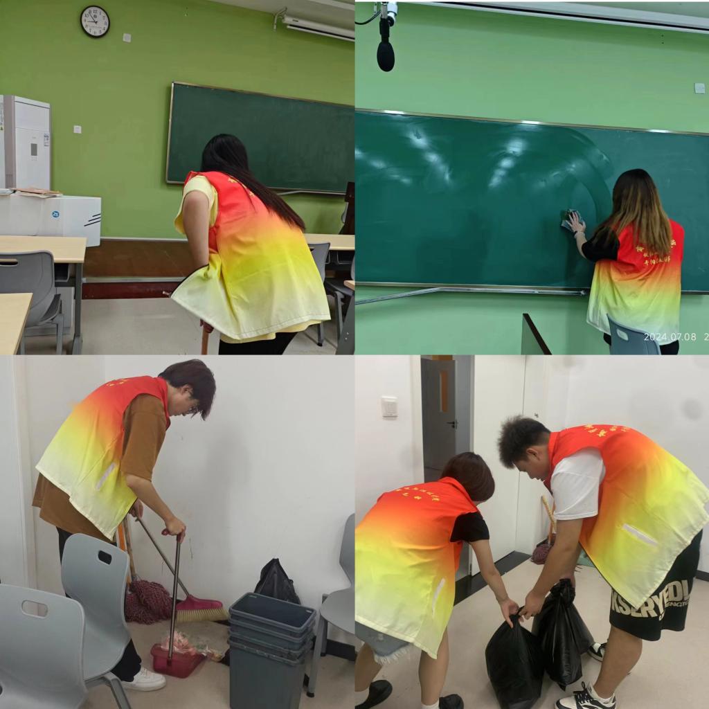 为巩固文明校园建设成果,服务备考学生,商贸与流通学院学生第一党支部在7月7日-9日学院集中考试期间开展“锤炼党性修养 践行党员担当”主题活动,46名学生预备党员挺膺担当,主动承担学院分管17间教室(考场)的卫生清洁工作。
