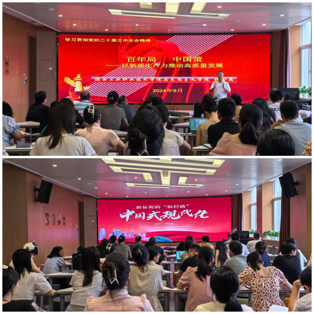 活动包括专题学习和集中研讨两个环节。专题学习环节,张金英和陈杜昊两位老师分别以《百年局中国策——以新质生产力推动高质量发展》和《新征程的“取经路”中国式现代化》为题进行领学。张金英老师从新质生产力在《决定》中的重要地位、从“两个大局”看新质生产力、深刻理解新质生产力的丰富内涵和核心要义、牢牢把握以新质生产力推动高质量发展的基本要求四个方面阐释了“什么是新质生产力,怎样发展新质生产力”。陈杜昊老师以探寻现代化源头切入,通过比较中西现代化道路的根本差异阐明了全会“进一步全面深化改革、推进中国式现代化”的主题,带领全体与会党员深入学习了党的二十届三中全会精神深邃的思想,引导大家以高度的自觉性把思想和行动统一到党的二十届三中全会精神上来,在日常工作中做到学思践悟、融会贯通。
