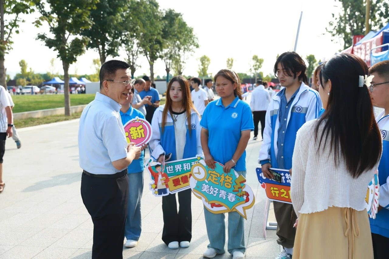 在经开校区迎新现场,我校党委书记惠朝阳、党委副书记贺天柱来到了心理咨询中心迎新点进行了工作指导与亲切慰问。惠朝阳书记在与2024级新生们的亲切交流中提出,希望同学们树立健康的恋爱观、择友观、就业观、人生观,在关注与关爱自我心理健康的同时,树立正确的人生目标。