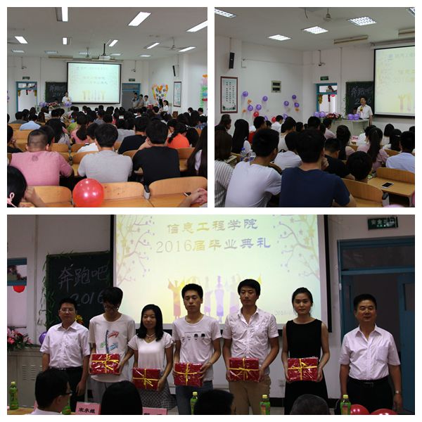 信息工程学院6月30日上午,信息工程学院2016届毕业生典礼暨毕业证颁发仪式在崇文西楼202室举行。信息学院党总支书记闫军、院长何玉辉、副院长殷锋社,教学办主任宋承继,学工办主任何瑾及全体辅导员、班主任、毕业生代表、在校生代表近200人参加了毕业典礼。何玉辉向圆满完成学业、顺利毕业的402名毕业生表示衷心的祝贺,分享了大学三年同学们的陕西工院印迹,希望同学们用能力去改变能改变的,用胸怀接受不能改变的;乘“互联网+”之东风,理性判断,智慧抉择,把握机会,成就未来IT职业梦想;始终牢记“从善如登、从恶如崩”的道理,须知“明智为高、知足为富、纯净为美”的境界,努力做一个道德高尚的人。两届国赛一等奖优秀指导教师李爱国作为教师代表发言,他期望同学们定位自己,树立目标,诚信做人,踏实做事,适应社会,调整自己,不断修炼,成为能力出众和身心健康的人。电信1301班田彦锦、信管1501班苏玥同学分别代表所有毕业生、在校生发言。闫军希望同学们永远珍藏大学生活的难忘时光,珍惜彼此结下的深情厚谊,用青春的激情、执着的信念、过硬的本领,开创更加绚丽的人生。最后,何玉辉为毕业生代表颁发了毕业证书。