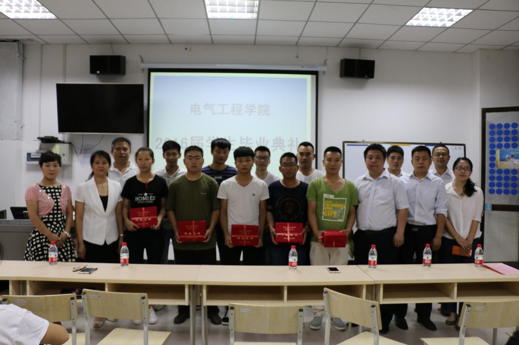 电气工程学院 6月30日上午,电气工程学院2016届学生毕业典礼及毕业证发放仪式在行知楼欧姆龙实训室举行。电气学院党总支书记杜云、院长段峻、副院长夏东盛,教学办主任张艳、工程训练中心主任白洁、学工办主任王永康与该学院全体毕业生参加典礼。段峻对电气学院532名2016届毕业生完成学业、顺利毕业表示祝贺,并对他们即将走上工作岗位,在职业生涯中创造佳绩寄予了厚望,也欢迎同学们在工作之余常回母校看看。在师生代表董佳辉、王文举发言后,电气学院领导为毕业生颁发了毕业证书,并和部分毕业生进行了座谈,殷切期望各位同学踏实做人,认真做事,开拓创新,祝愿同学们在人生的道路上,生活幸福,事业有成。