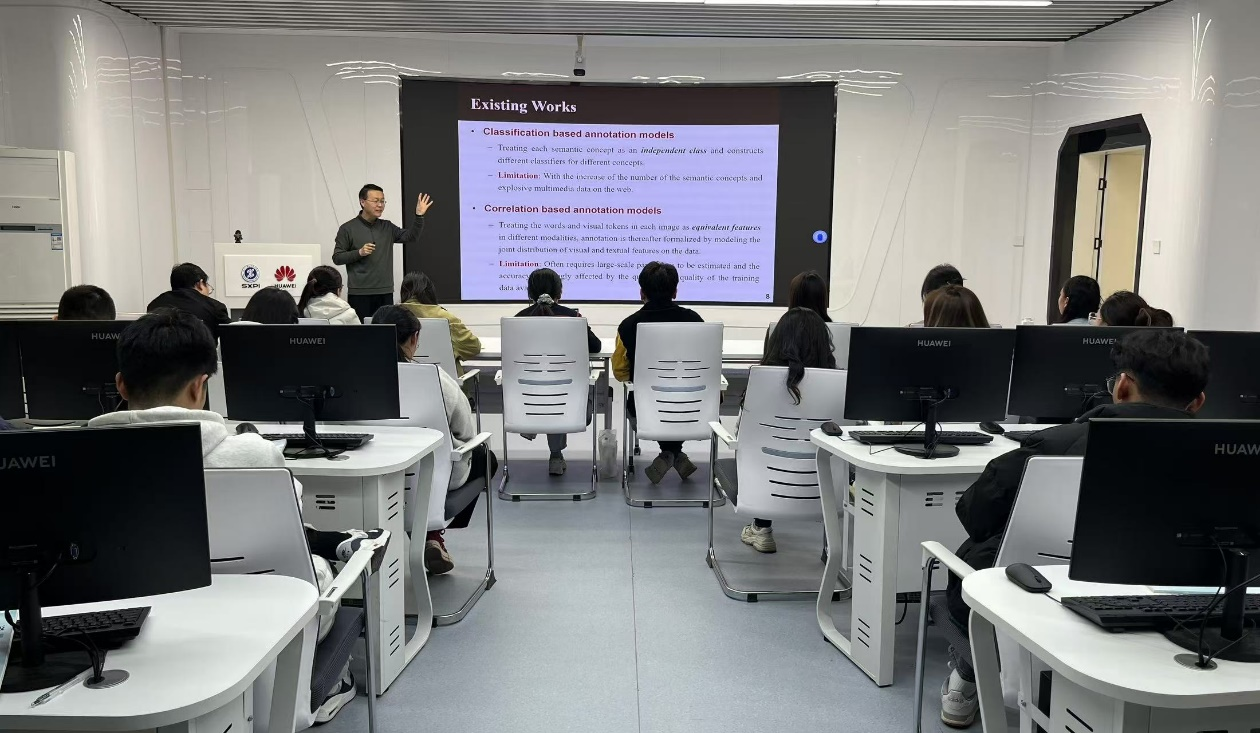 会上,田东平教授围绕计算机视觉方向最新的研究课题及成果进行深入讲解。首先,田教授介绍了图像标注技术的背景和重要性。接着,分享了考虑跨模态相关性的基于GMM的自动图像标注方法的创新,强调了跨模态相关性在自动图像标注中的重要性。最后,展示了该方法的实验结果,并与传统的图像标注方法进行了对比。报告过程中,田东平教授深入浅出、旁征博引,全面展示了计算机视觉领域的最新研究成果,传授了科研方法和心得,参会师生认真聆听,并积极进行互动交流。