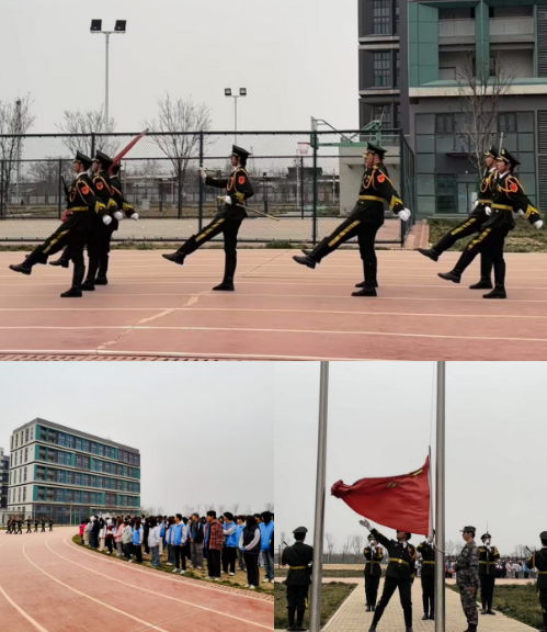 晨曦微露,国旗护卫队踏着铿锵步伐护送国旗入场。伴随着雄壮的《义勇军进行曲》,五星红旗冉冉升起,全体师生面向国旗肃立,行注目礼并齐唱国歌。
