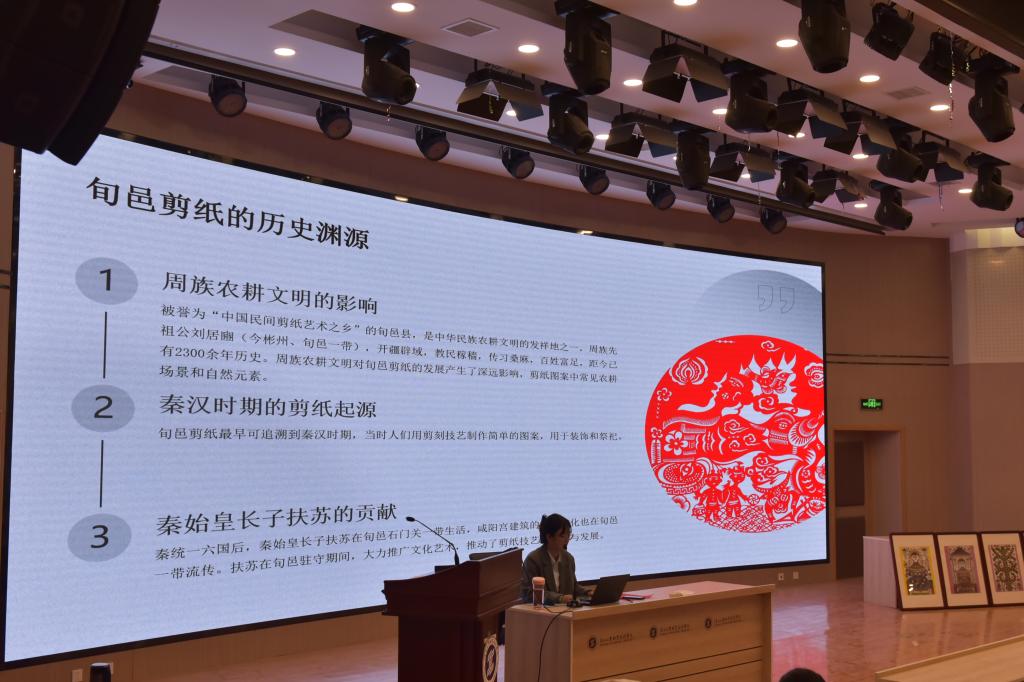 4月22日下午,由我校美育部主办、化工与纺织服装学院协办的《美“育”芳华》系列讲堂第四期在渭城校区学术会堂如期举行。本期讲座特邀美育部曹金老师担任主讲,以《旬邑彩贴剪纸:藏在身边的色彩盛宴》为题,带领师生领略国家级非物质文化遗产的独特魅力,现场气氛热烈,座无虚席。