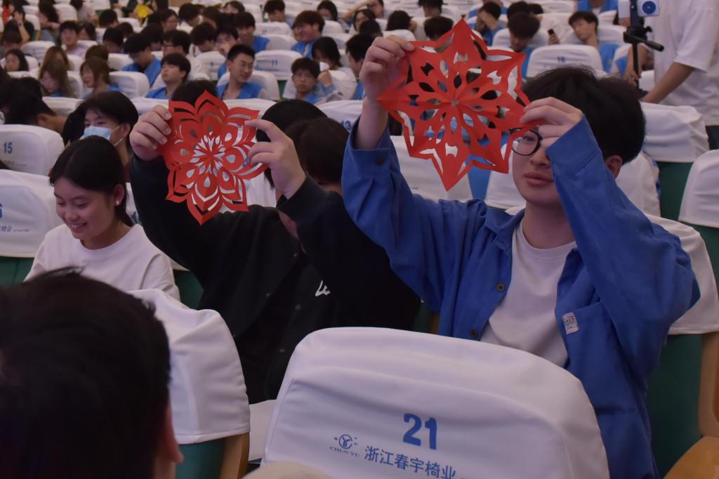 互动环节,曹金老师现场演示剪纸技巧,师生们踊跃参与实践,亲手体验剪窗花的乐趣。