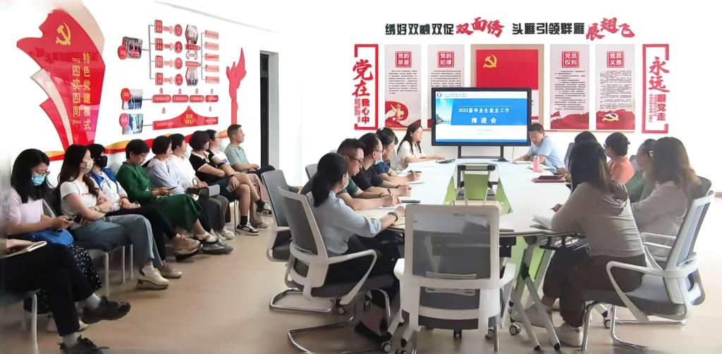会上,学工办主任曹淼首先领学了学校最新的就业考评文件,并对文件中的关键指标和要求进行了详细解读。随后,年级辅导员闫琼汇报了2025届毕业生的最新就业数据,并从就业落实率、签约单位分布、专业对口率、困难学生就业情况等方面进行了分析。接着,毕业班班主任依次对班级就业情况进行了汇报,详细介绍了本班的就业情况以及当前就业工作中面临的主要挑战。