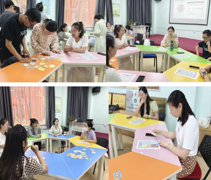 活动以“放松按摩操”“桃花朵朵开”等趣味破冰游戏拉开序幕,教师们通过肢体互动迅速打破隔阂,现场氛围轻松热烈。在“OH卡与心灵探索”环节,教师们通过随机抽取的图卡展开自我剖析。在主体活动“乔哈里窗”中,教师们抽取四张OH卡牌,分别对应“公开的我”“盲点的我”“隐藏的我”与“潜力的我”,并通过小组讨论展开深度探索。随着小组分享的深入,教师们逐渐敞开心扉,在倾听与共鸣中建立起情感联结。卡牌成为打开心门的钥匙,帮助教师重新审视自我认知与他人评价的差异。