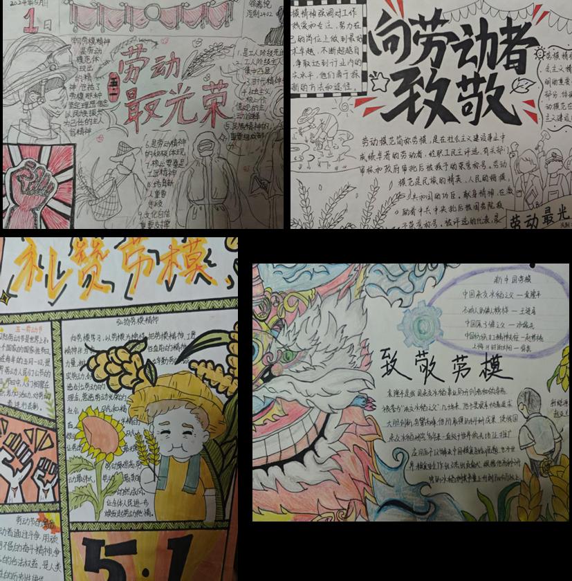 活动中,同学们积极查阅资料,深入了解劳模事迹和劳模精神的内涵。他们充分发挥想象力和创造力,将文字与绘画巧妙结合,精心设计每一幅手抄报。有的同学以大国工匠为主题,用细腻的笔触描绘出工匠们专注工作的场景;有的同学选取身边的劳动模范,用生动的文字讲述他们的感人故事;还有的同学运用鲜艳的色彩和独特的排版,展现劳模精神对新时代青年的激励作用。