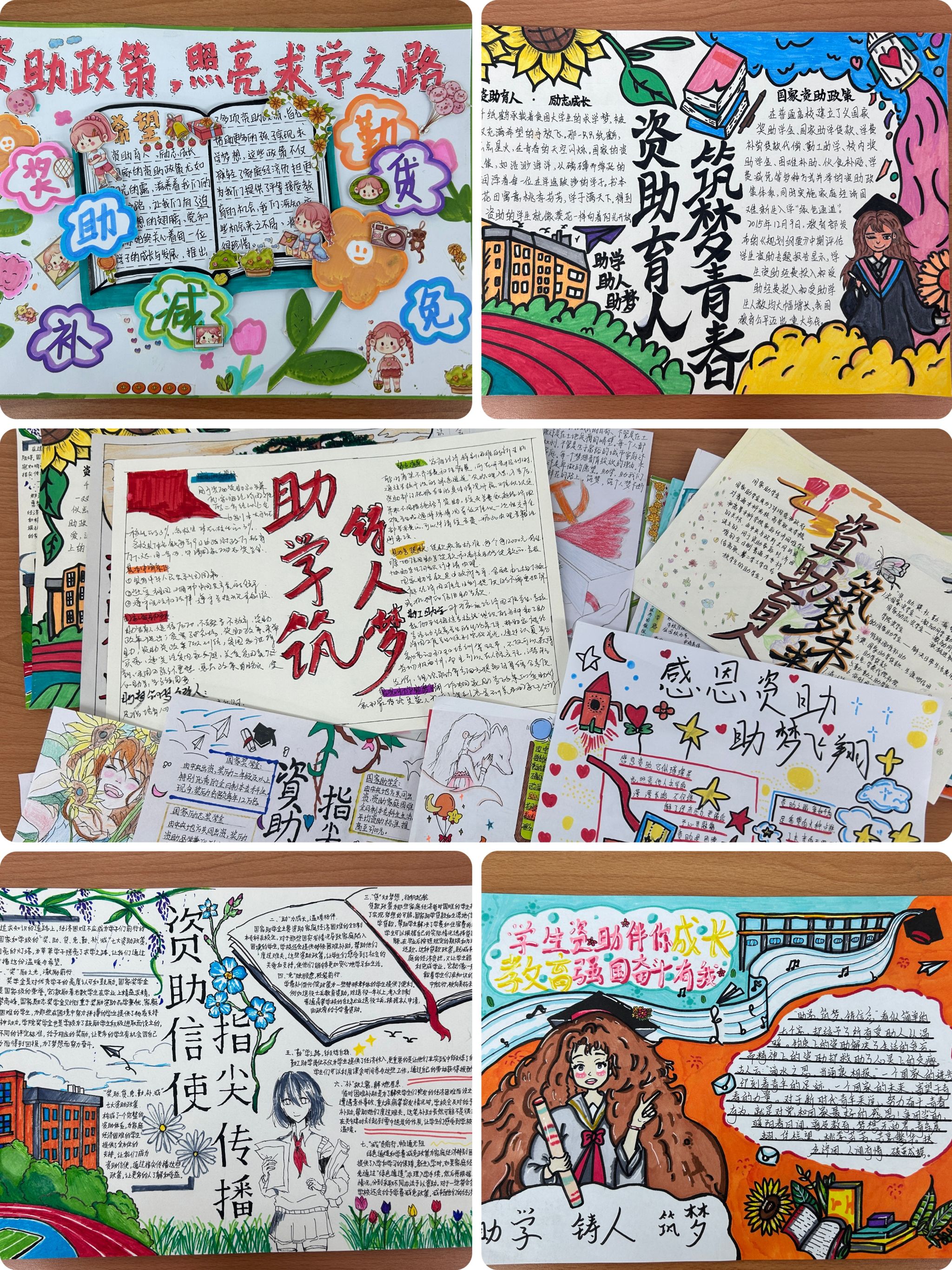 本次大赛共征集作品50余份,参赛者围绕“国家资助政策”“感恩励志”“诚信教育”等主题,精心设计、用心创作。手抄报作品风格多样,有的以生动的插画展现资助政策的暖心细节,有的以清晰的图表解读助学贷款、奖助学金等政策要点,还有的通过真挚的文字讲述受助学生的成长故事。每一份作品都凝聚着同学们对国家资助政策的理解与感激,在方寸纸页间展现了政策温暖与青春力量的完美交融。
