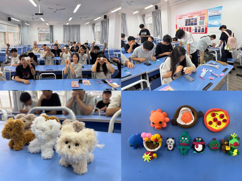 活动现场是创意十足的手作工坊,丰富多样的手工材料激发着同学们的创作热情。扭扭棒在指尖灵活翻转,幻化成灵动小动物、娇艳花朵等充满想象力的作品;细腻粘土经揉捏塑形,诞生出憨态小熊、萌趣多肉等可爱形象,让压力随创作悄然释放;造景贴纸区,同学们巧妙组合,搭建出一个个专属童话世界。