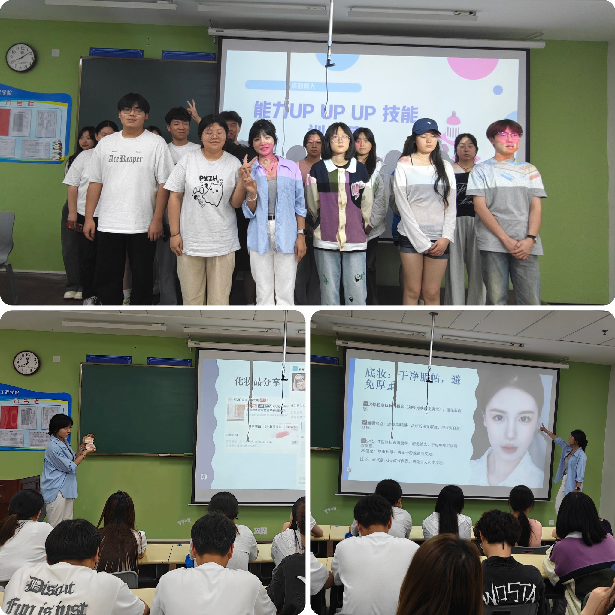 大艺团成员数媒2405何新荣同学结合自身舞台形象设计经验,从职场场景需求出发,系统讲解“得体、大方、专业”的着装原则。在妆容教学环节,重点演示了“五分钟通勤妆”技巧,强调干净清爽的妆面与个人气质的契合,同时为同学们推荐了平价实用的美妆产品清单。多名同学表示“学会了用细节提升专业感”“面试妆容原来这么重要”。