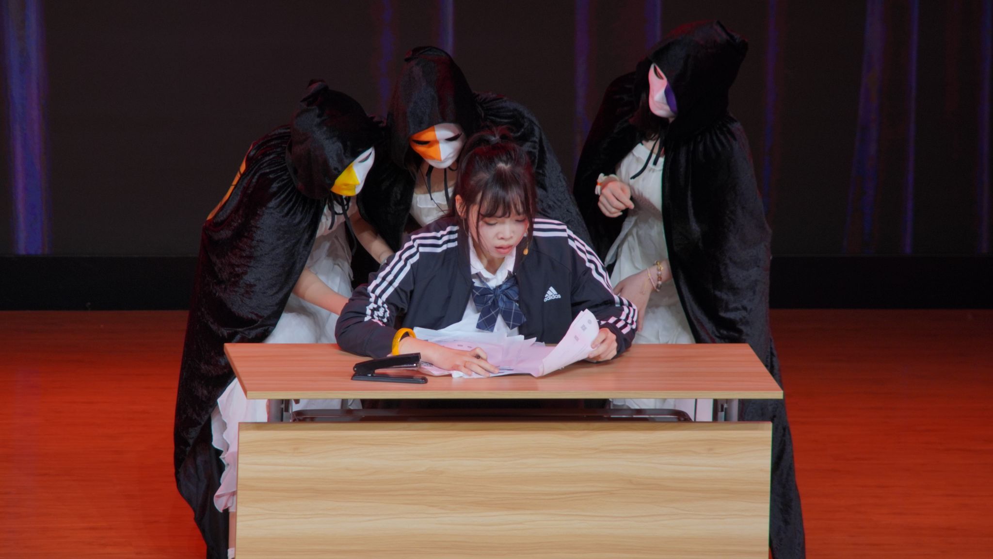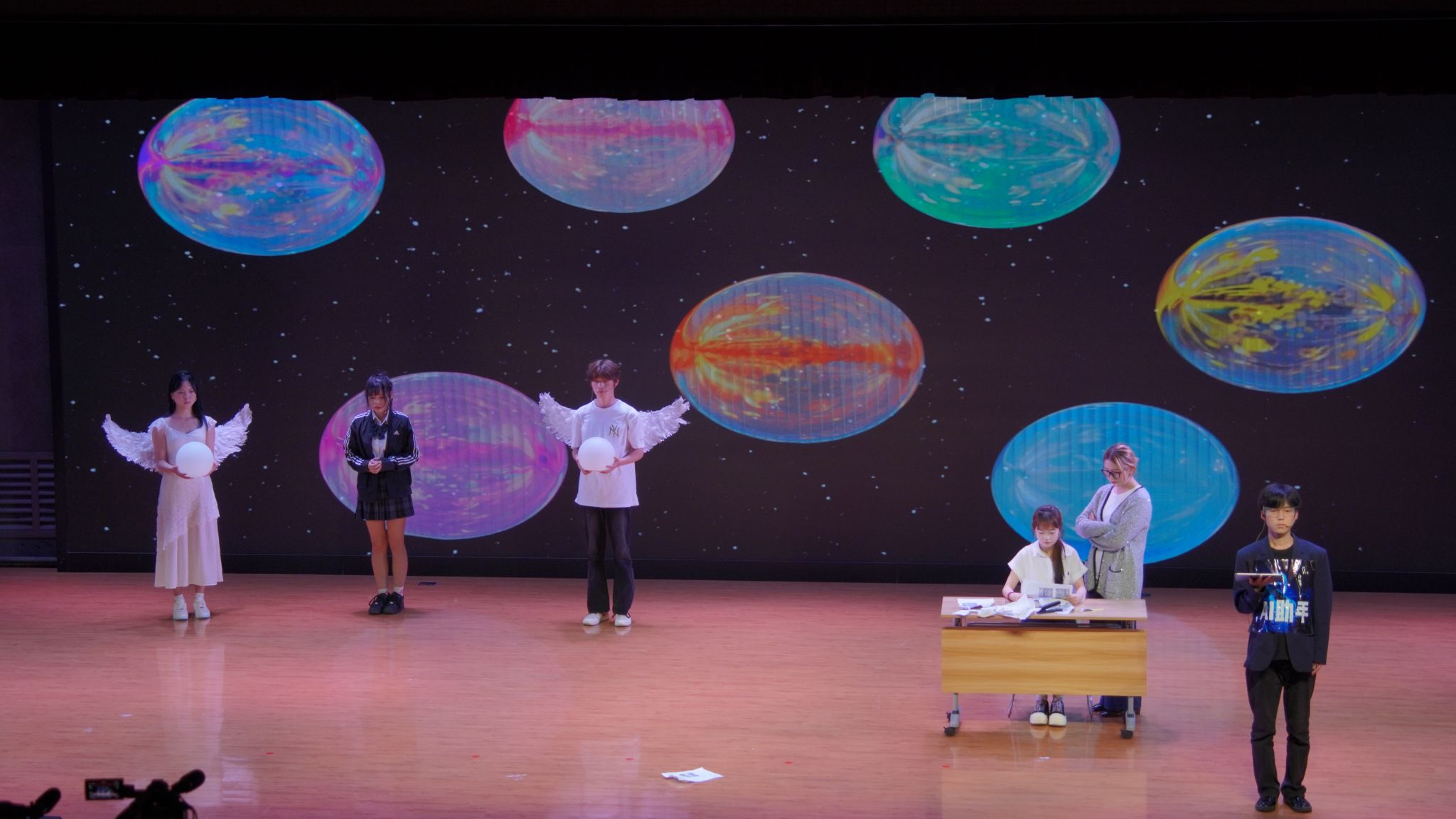 《紫色彩虹的呼吸法则》由我校心理咨询中心董亲子、任雨睿老师指导,校心理健康协会和话剧社成员共同配合完成演出,获第六届陕西高校校园心理情景剧优秀剧目一等奖,是我校尝试以心理情景剧形式开展校园心理健康教育活动的成功作品之一。作品讲述了大二女生乔伊在焦虑、自我怀疑与完美主义的重压下濒临崩溃,最终通过AI助手与童年记忆的引导,重新找回自我的故事。剧中通过交互LED墙、影子舞者等创新形式,展现乔伊从数据化的焦虑到自我疗愈的蜕变。她撕碎“标准答案”,拥抱不完美,最终学会在裂缝中寻找光照。作品通过影子舞者具象化消极情绪,以紫色彩虹隐喻心灵希望,展现从数据压力到接纳不完美的蜕变。AI的人性化转变与“成长比完美更重要”的信念,引导观众在快节奏中守护内心柔软,具有温暖的心理疗愈与现实启发作用。