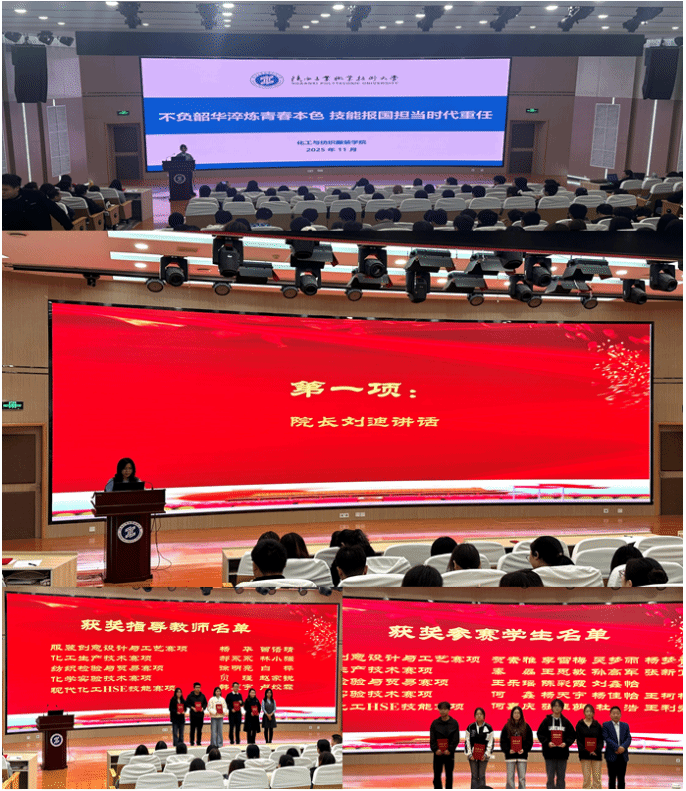 为全面总结2025年技能大赛的辉煌成果,表彰先进,传承拼搏精神,并为2026年新赛季吹响冲锋号角,化工与纺织服装学院于11月7日下午在学术会堂隆重召开技能大赛总结表彰暨2026年备赛启动大会。学院党总支书记杨修国、院长刘迪及学院全体教师、2024级与2025级学生共计三百余人齐聚一堂。