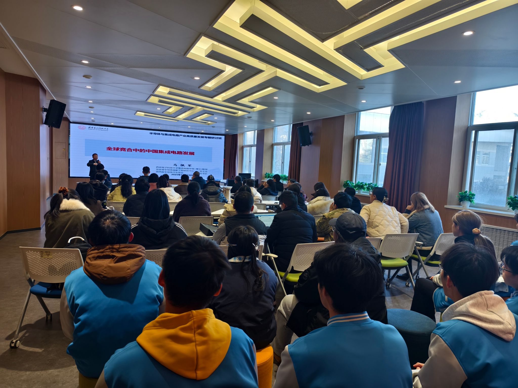 讲座中,马佩军教授从集成电路的战略地位切入,系统梳理了其技术发展脉络与前沿进展。他重点剖析了全球产业链“竞争与合作”并存的复杂态势,并基于详实的数据,深刻阐述了中国集成电路产业取得的成就、面临的挑战及未来的破局方向。最后,他从历史、技术与行业规律的多维视角进行总结升华,为师生提供了高屋建瓴的产业洞察。整场报告内容翔实,逻辑严谨,现场互动热烈,掌声不断。