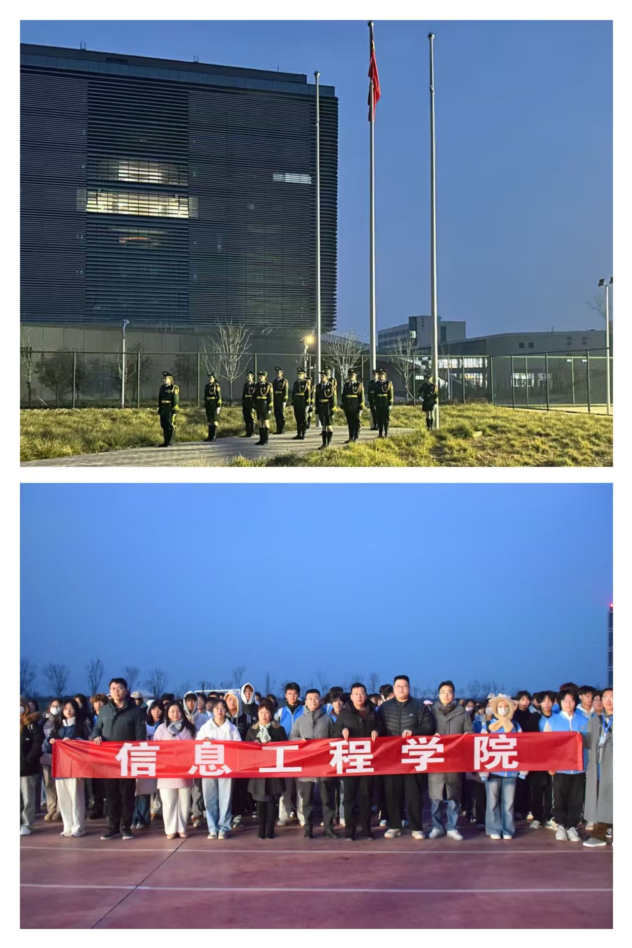 为引导大学生将文明素养内化于心、外化于行,以良好行为习惯夯实青春成长根基,12月22日清晨,信息工程学院在经开校区举行了以“涵养文明习惯 铸就青春底色”为主题的升旗仪式。信息工程学院党总支书记王伟、党总支副书记郭新玲、学工办主任赵松、学工办辅导员及2025级学生代表参加了本次活动。