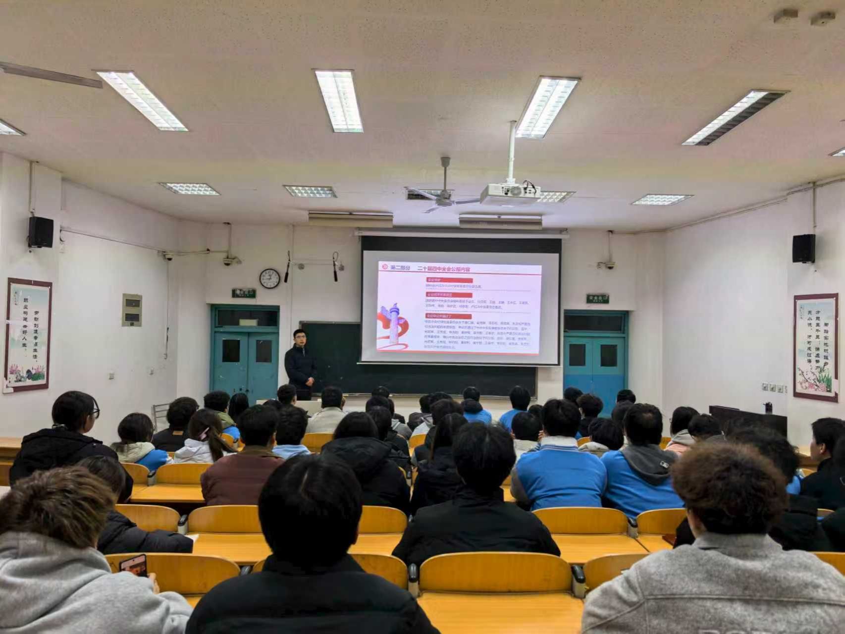 为全面深入学习领会党的二十届四中全会精神,扎实推进学习宣传贯彻工作,1月4日晚,电气学院学生第二党支部书记陈春山在崇文西楼102教室以“深入学习贯彻党的二十届四中全会精神”为主题讲授专题党课,学生入党积极分子及预备党员参加学习。