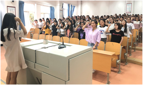 志愿者代表、电信1702班王佩瑜同学代表全体志愿者发言,她号召大家要端正态度,贡献力量,用饱满的热情迎接排练。随后,全体志愿者举起右手,进行了庄严宣誓:“我志愿加入陕西省第十六届省运会志愿者队伍,弘扬志愿精神,奉行志愿者宗旨……”大家立志积极排练、团结进取,全力以赴、不辱使命!