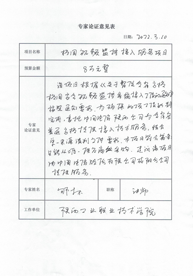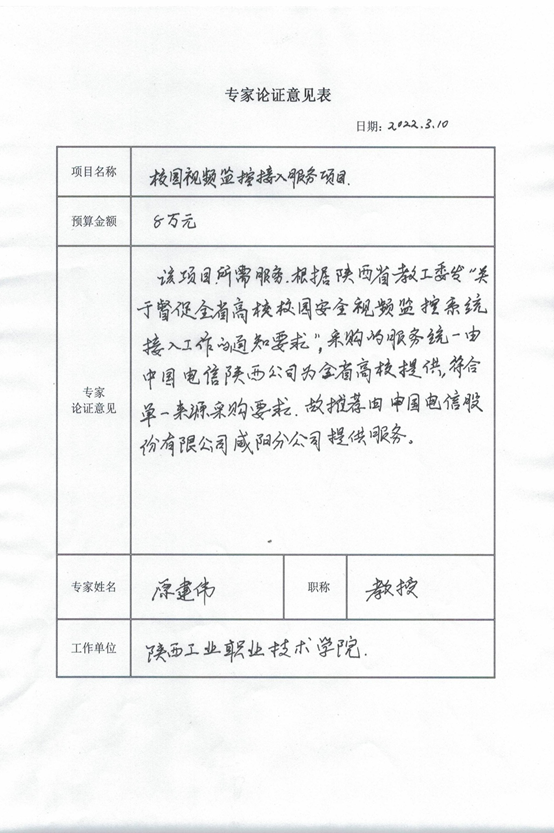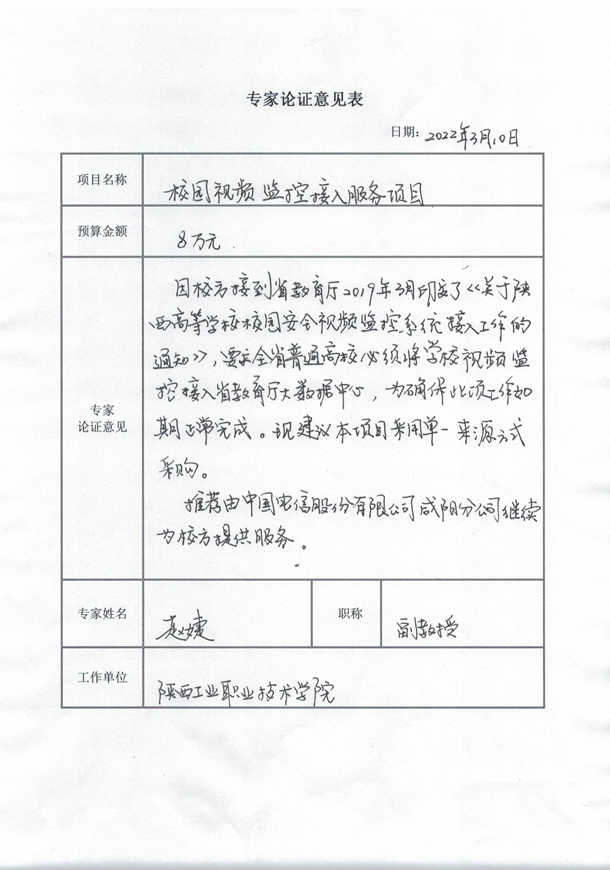 根据《关于督促全省高校校园安全视频监控系统接入工作的通知》及相关专家论证意见,陕西工业职业技术学院校园视频监控接入服务项目拟采用单一来源采购方式,该项目拟由中国电信股份有限公司咸阳分公司承担。现将有关情况向潜在的供应商广泛征求意见。征求意见期限从2022年3月10日起至2022年3月17日止。