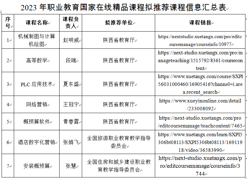 2023年职业教育国家在线精品课程申报工作拟推荐课程的基本信息公示期为5天(2024年1月22日至1月26日)。公示期间若有异议,可咨询教务处教学科,电话029-33152138。
