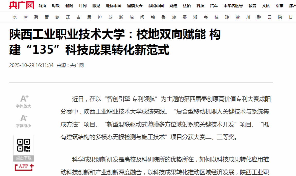 【七五·华章】央广网:陕西工业职业技术大学校地双向赋能 构建“135”科技成果转化新范式