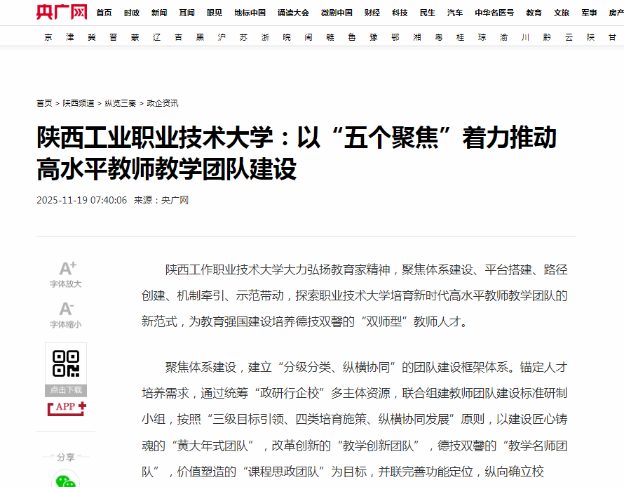 【七五·华章】央广网:陕西工业职业技术大学以“五个聚焦”着力推动高水平教师团队建设