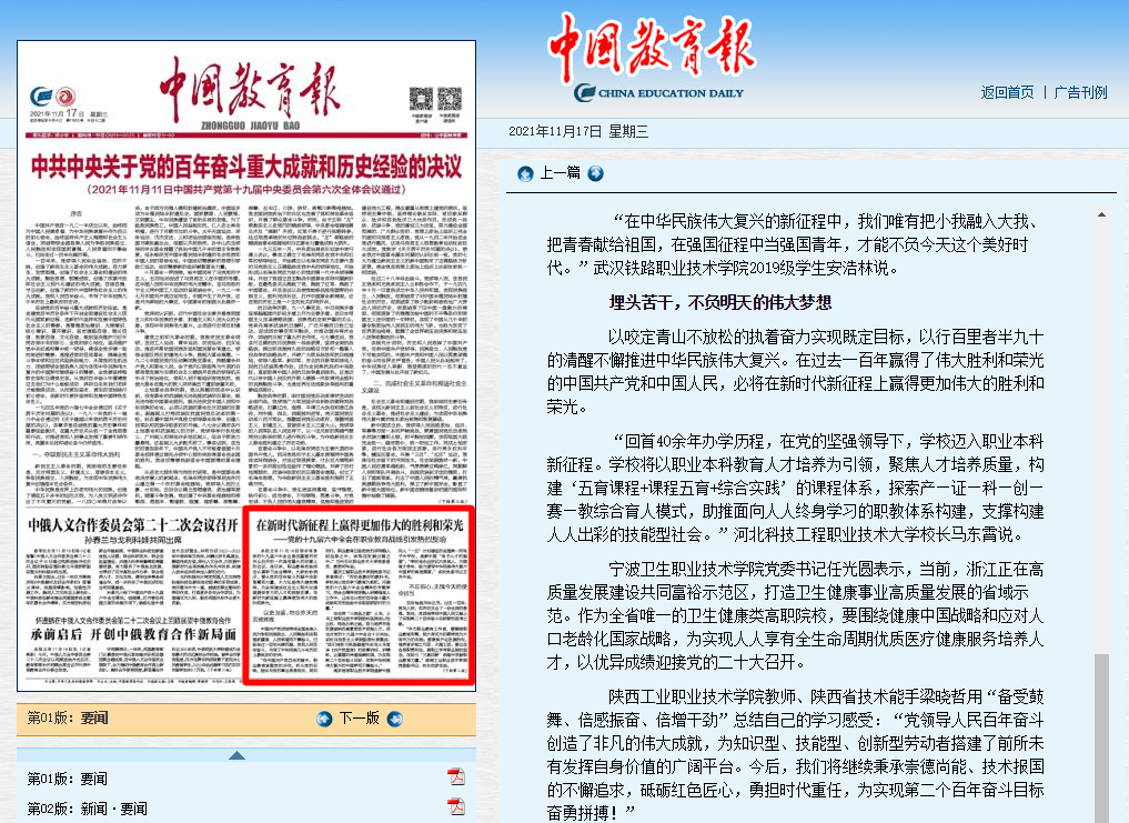 中国教育报—党的十九届六中全会在职业教育战线引发热烈反响