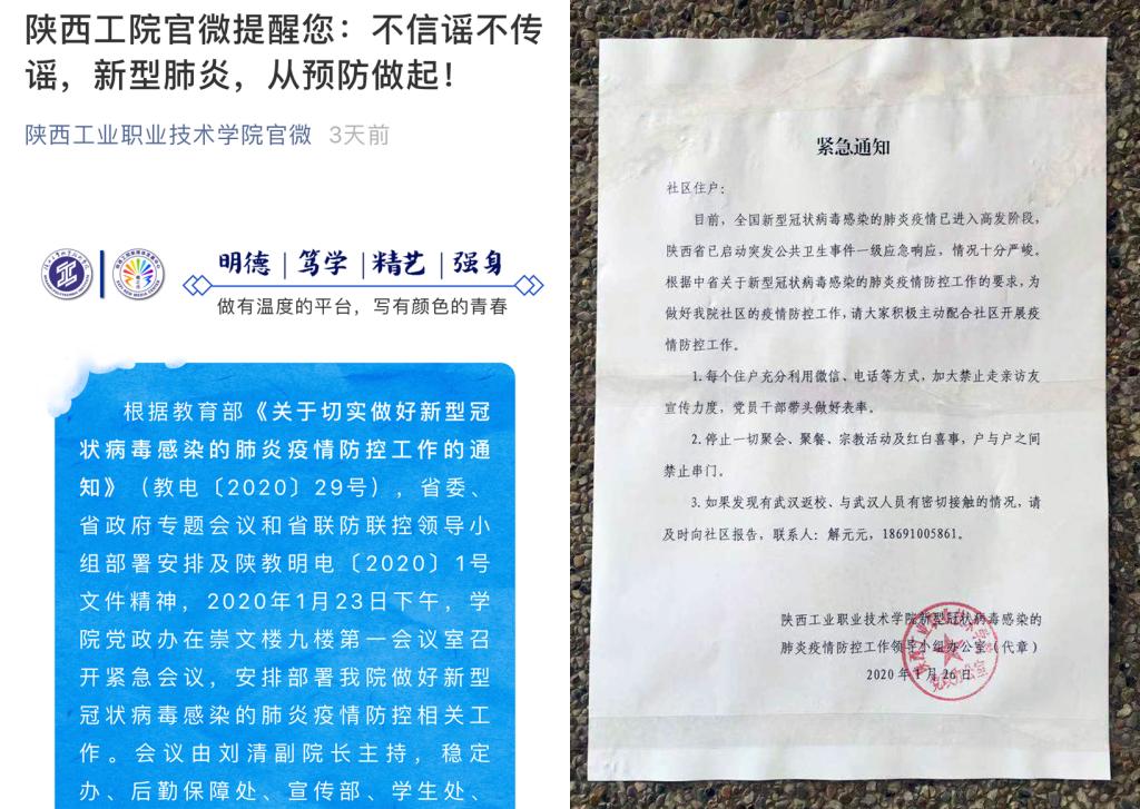 近期,湖北省武汉市等多个地区发生新型冠状病毒感染的肺炎疫情,我省已启动突发公共卫生事件一级应急响应。根据教育部《关于切实做好新型冠状病毒感染的肺炎疫情防控工作的通知》,省委、省政府专题会议和省联防联控领导小组部署安排及陕教明电〔2020〕1号文件精神,陕西工院高度重视、迅速响应,连日来,学院领导靠前指挥,各部门及二级院部积极配合,全力做好疫情防控工作。