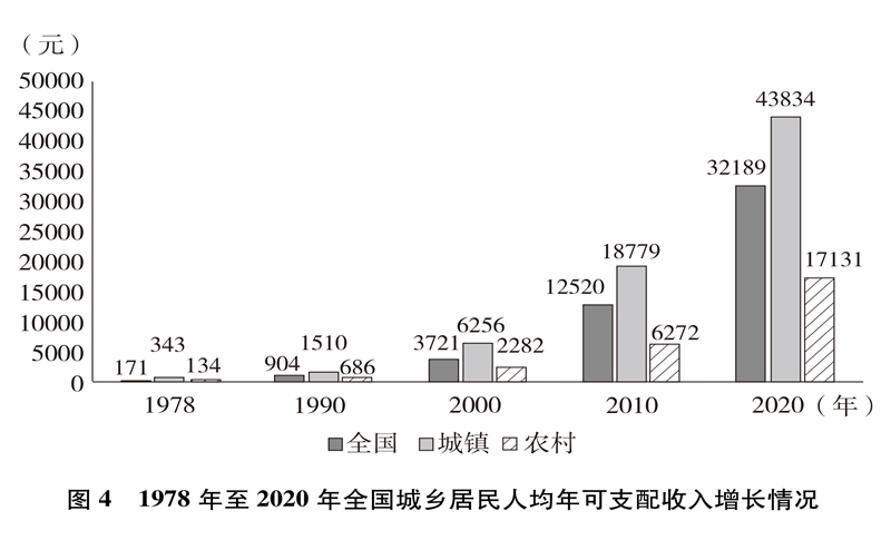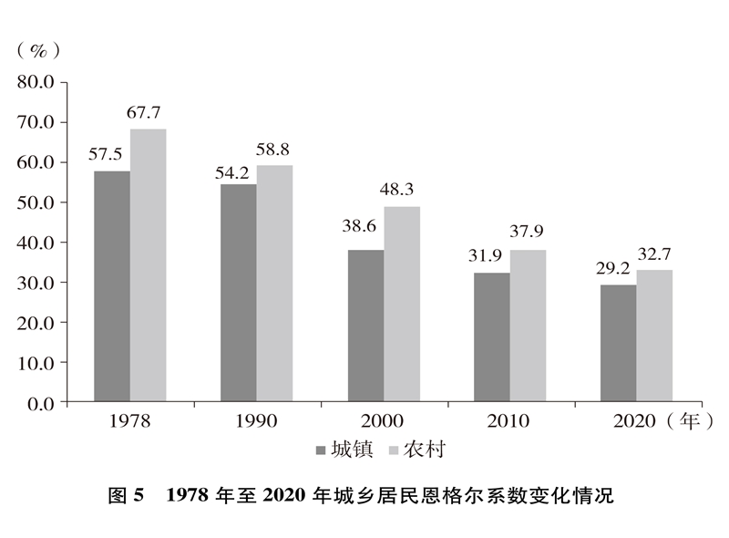 人民生活水平显著提高。居民收入持续增加,全国居民人均年可支配收入从1978年的171元增加到2020年的32189元(图4)。城乡居民恩格尔系数分别从1978年的57.5%、67.7%下降到2020年的29.2%、32.7%(图5),城乡居民生活质量不断提升。温饱问题解决后,人们对生活品质、品位有了更高的追求,衣食住行不断升级,消费结构从生存型逐渐向发展型、享受型过渡。衣,从穿暖到穿美、穿出时尚;食,从吃饱到吃好、吃出健康;住,从有所居到更敞亮、更宜居;行,从便利通畅到快捷舒适。吃穿用有余,家电全面普及,乘用汽车快速进入寻常百姓家。餐饮、健康、教育、旅游、文娱等服务性消费持续快速增长,在居民人均消费支出中占比逐渐达到一半左右。越来越多的人有“钱”有“闲”,“诗和远方”更加触手可及,“说走就走”不再是梦想,旅游扮靓人们的幸福生活,中国正在进入大众旅游时代。