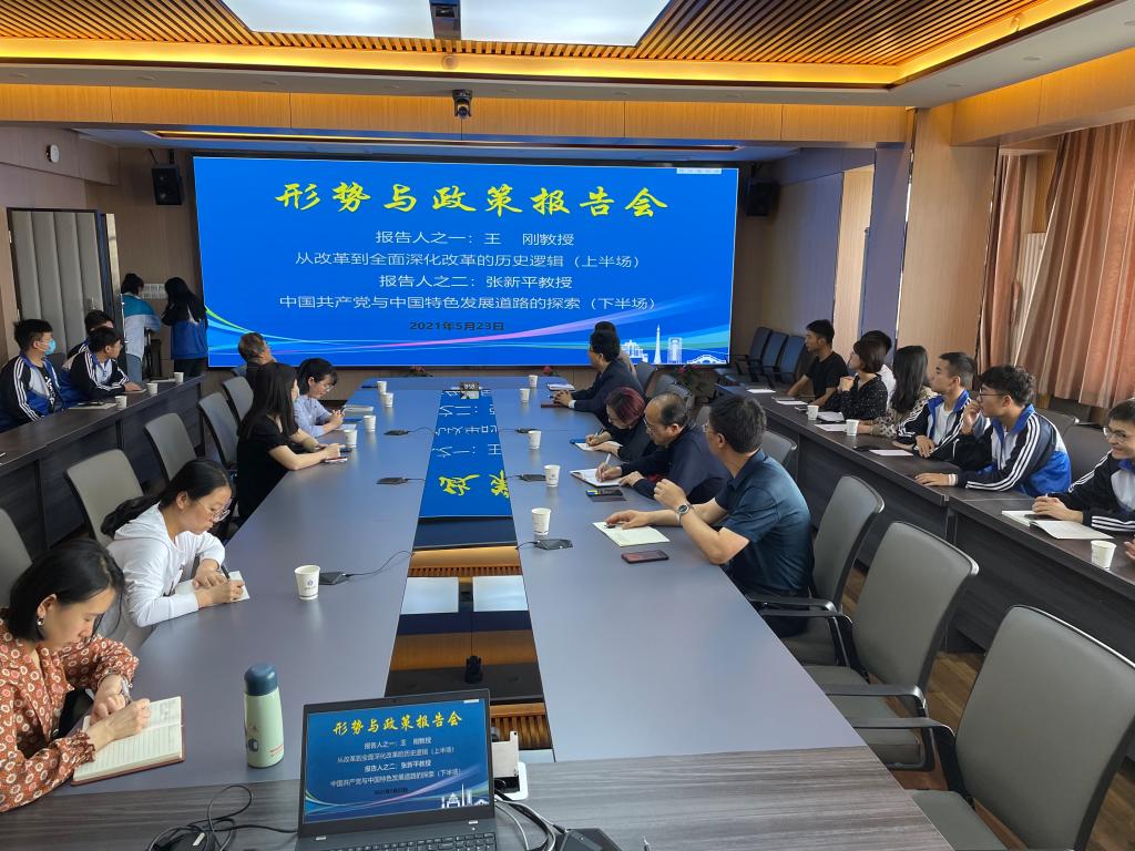 报告会由南京师范大学马克思主义学院院长、教授、博士生导师王刚和兰州大学马克思主义学院院长、教授、博士生导师张新平讲授,分为《从改革到全面深化改革的历史逻辑》和《中国共产党与中国特色发展道路的探索》两个主题。报告中,张新平教授从“28年革命与中国革命道路的探索”“30年社会主义建设与中国的探索”“改革创新:中国特色社会主义发展道路的形成及其世界意义”“中国特色发展道路探索的反思”四个部分讲述了中国共产党对中国特色发展道路的探索。王刚教授从“深入学习习近平论中国共产党历史”“认真研读党史基本著作,理解习近平论中国共产党历史 ”“深入推进党史学习教育,揭秘中国共产党为什么‘能’”三个部分全面讲述了习近平《论中国共产党历史》。