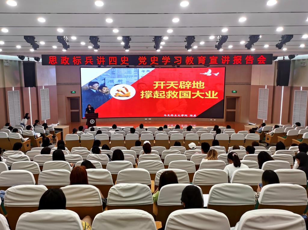 为庆祝中国共产党成立100周年,贯彻落实习近平总书记关于深化思政课改革创新和“大思政课”的重要指示批示精神,充分发挥思政课“标兵”的示范引领作用,6月4日上午,由宣传部主办的“红色故事会”系列活动之思政标兵讲四史宣讲报告会在学术会堂举行,我校“陕西高校思政课教学标兵”获得者陈晨老师作了题为《开天辟地撑起救国大业》报告,来自十个二级学院的近300余名师生代表参加。