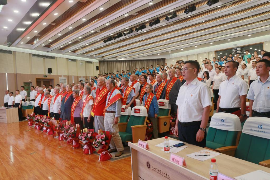 红色七月,党旗飘扬、党徽闪耀。7月6日下午,我校在学术会堂召开学习贯彻习近平总书记“七一”重要讲话精神暨“两优一先”表彰大会,以动员各基层党组织和广大党员集聚力量、汇聚智慧、凝聚人心,用实际行动推进学校“双高引领、新校建设、本科升格”三大使命任务,进一步让红色引擎激活学校高质量发展的磅礴动力。学校党委班子成员、各党总支书记、党支部书记、处科级干部以及荣获“光荣在党50年”纪念章老同志代表、省委、省委教育工委、学院“两优一先”代表、新党员代表,共计400余人参加了会议,会议由党委副书记田昊同志主持。
