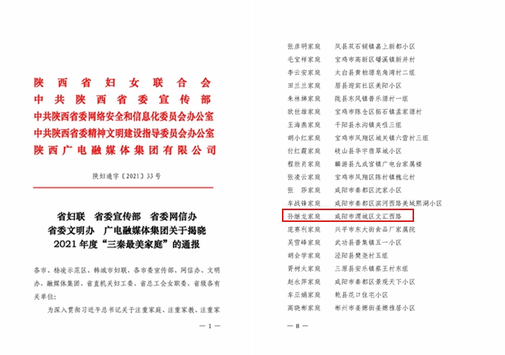 近日,陕西省妇联、省委宣传部、省委网信办、省委文明办、陕西广播融媒体集团有限公司联合揭晓了2021年度“三秦最美家庭”名单,我校职工孙继龙、桓美丽家庭荣获2021年陕西省“三秦最美家庭”荣誉称号。这是孙继龙、桓美丽家庭继荣获2020年咸阳市“最美家庭”荣誉称号之后的又一重要荣誉。