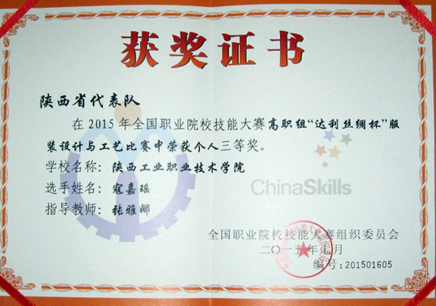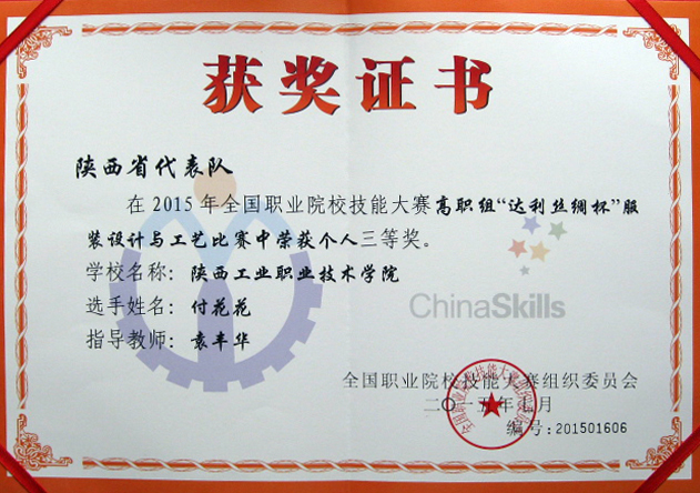6月14日,2015年全国职业院校技能大赛“达利丝绸杯”服装设计与工艺赛项在浙江杭州职业技术学院落下帷幕,乐游棋牌服装工程学院组成陕西省代表队参赛,经过十个小时的激烈角逐,由袁丰华老师指导的服装制版与工艺1301班付花花同学,张雅娜老师指导的服装制版与工艺1301班寇佳瑶同学荣获制版与工艺赛项的两个三等奖。