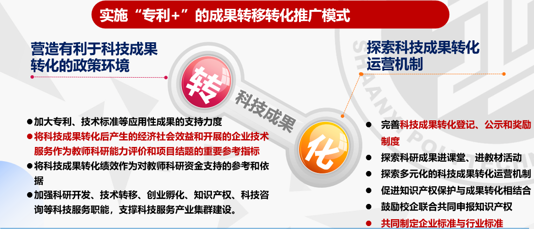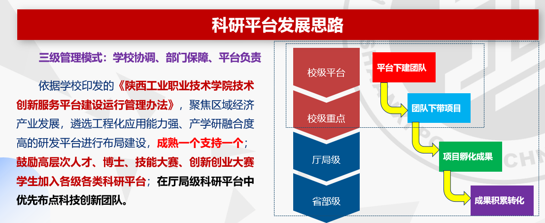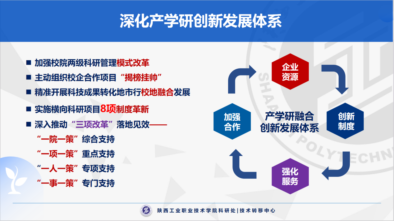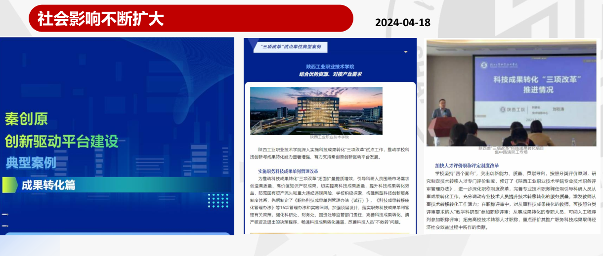 学校重点围绕知识产权、职称聘任、设备采购、信息化服务等出台了16项管理办法和3项实施细则;围绕装备制造、新材料、新能源等省内主导产业,建成陕西省“四主体一联合”智能微网与PEM制氢储能装备校企研究中心、高性能航空材料与器件陕西省高校工程研究中心、复合型移动机器人陕西省高校工程研究中心、富硒农产品废弃物资源化利用陕西省高校工程研究中心等23个工程研究中心、重点实验室、院士工作站、智库等科创平台,建成航空航天用高温材料与器件陕西高校青年创新团队、新能源及自动化装备研发陕西高校青年创新团队等18个科技创新团队,获厅局级以上科研成果奖21项,立项厅局级科研项目102项(其中国基金3项),授权专利、软著等1398件;推进三级技术经理人队伍建设,108件知识产权实施成果转化,学校在机床磨床、柔性玻璃等关键技术领域牵头起草国家、行业、团体等技术标准6项,累计服务区域内中小微企业146家,为企业创造经济效益3.86亿元,改革经验被《中国教育报》《陕西日报》等媒体报道,走出了一条产教融合、科教融汇的新路子。