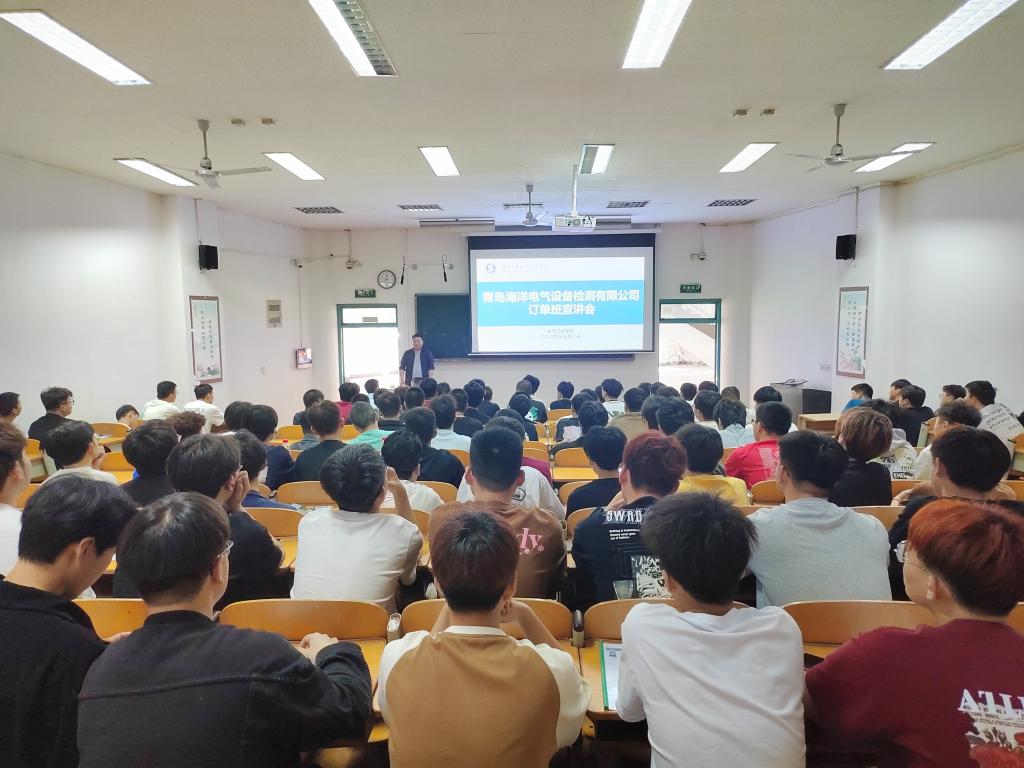 为进一步深化校企合作,助力地方产业发展,培养更高素质的技能人才、能工巧匠,5月10日上午,电气学院邀请青岛海洋电气设备检测有限公司在崇文西楼102教室举行订单班宣讲会,青岛海洋人力资源部相关负责人、电气工程学院党总支书记刘其兵、22级部分学生参加了宣讲会,会议由电气学工办主任赵松主持。