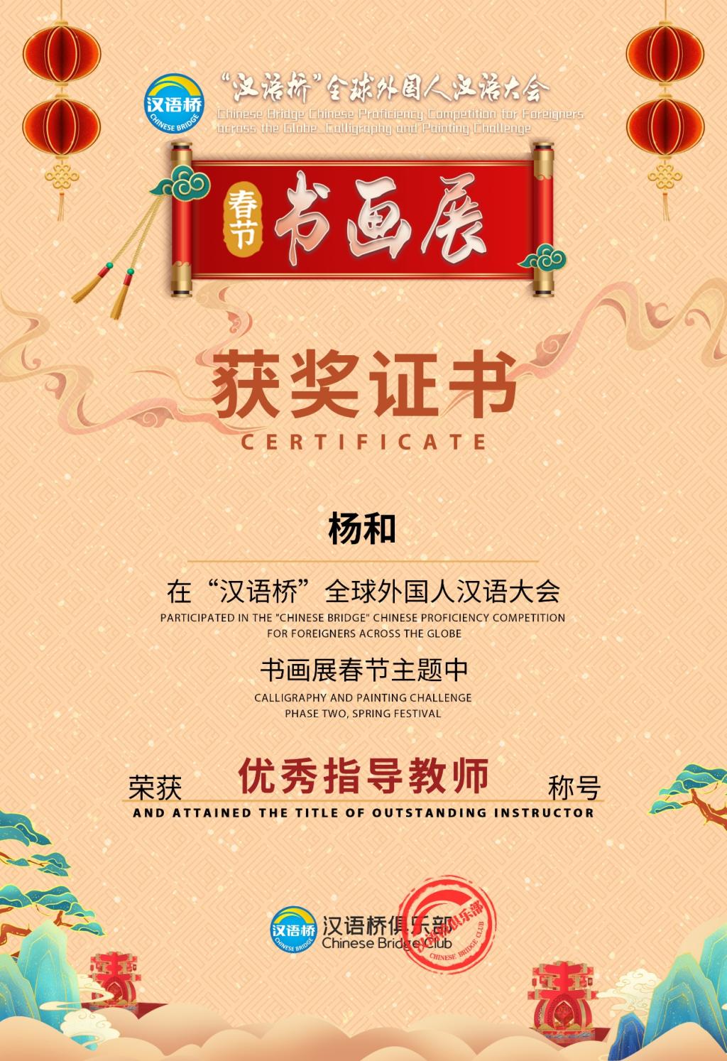 国际教育学院教师杨和在“汉语桥”书画展春节主题中荣获“优秀指导教师”称号