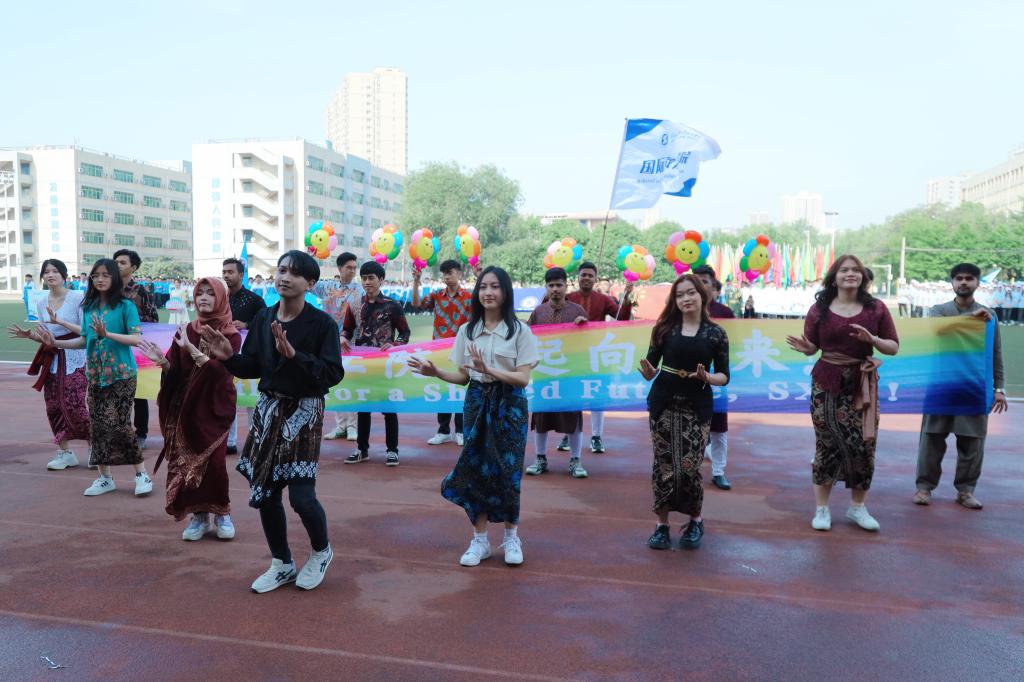 开幕式当天,留学生身着本国传统服饰,以饱满的精神与稳健的步伐步入主席台前。他们高举着带国际教育学院旗子,手拉五彩横幅“陕西工院一起向未来! Together for a Shared Future, SXPI!”,拿着笑脸气球高喊“我们爱你,陕工院!”。留学生以灿烂的笑容诉说着成为中外友好使者的追求与梦想,在主席台前演绎了印度尼西亚传统舞蹈,赢得现场掌声阵阵。