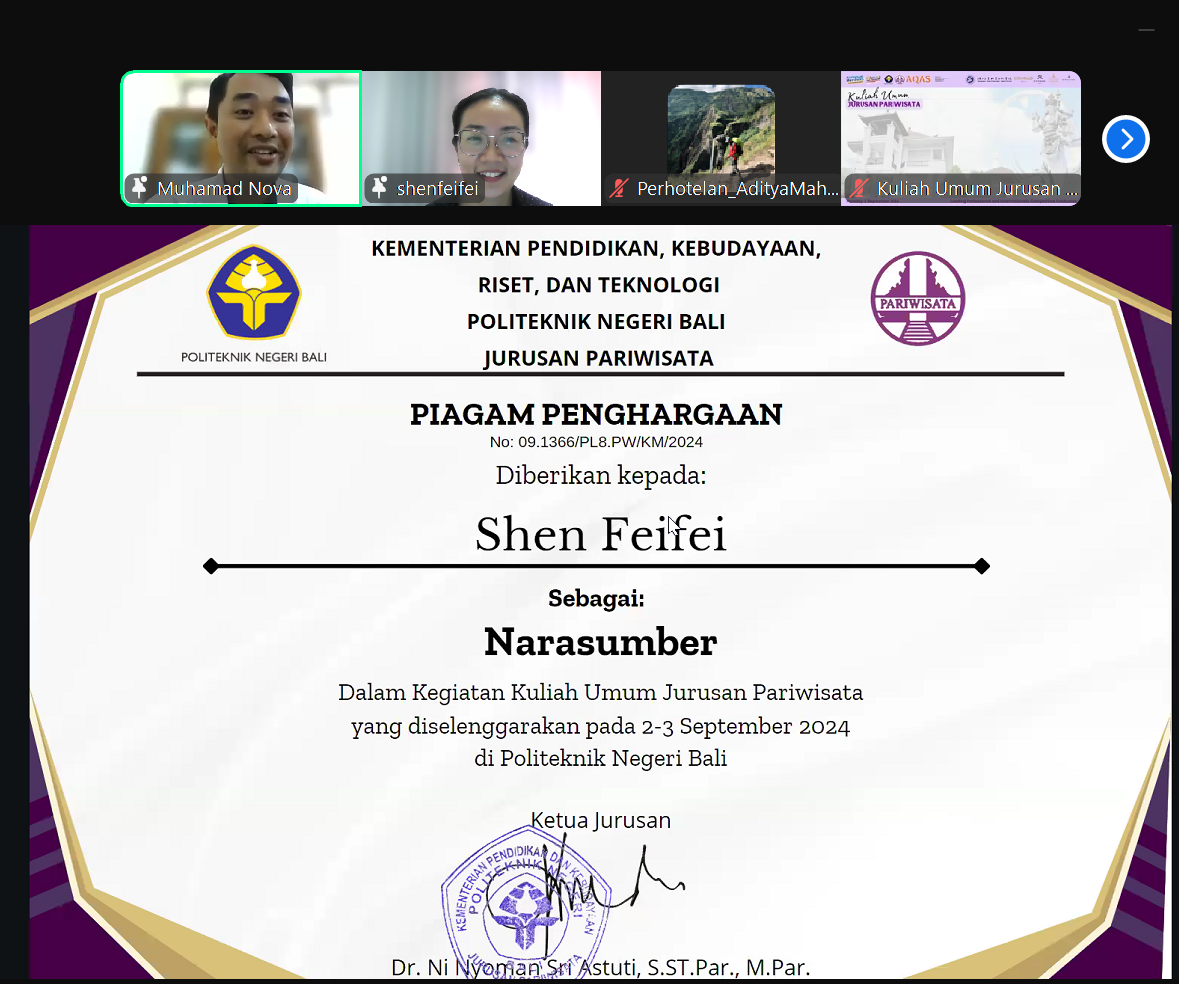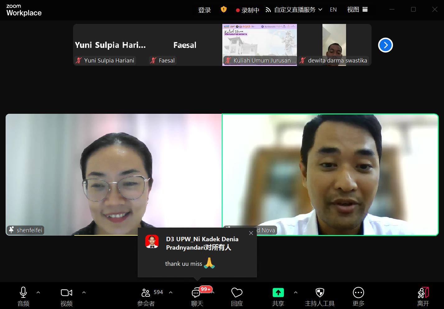 9月2日,应印度尼西亚巴厘理工学院旅游系的邀请,我校《商务礼仪》省级在线开放课主讲教师--公共课教学部沈菲菲副教授在线上参与了该校组织的国际交流活动,并为其旅游专业师生开展了题为“Introduction to Business Etiquette”的专题讲座。印度尼西亚巴厘理工学院旅游系专业教师和三个年级的学生共近六百人参加了本次讲座。