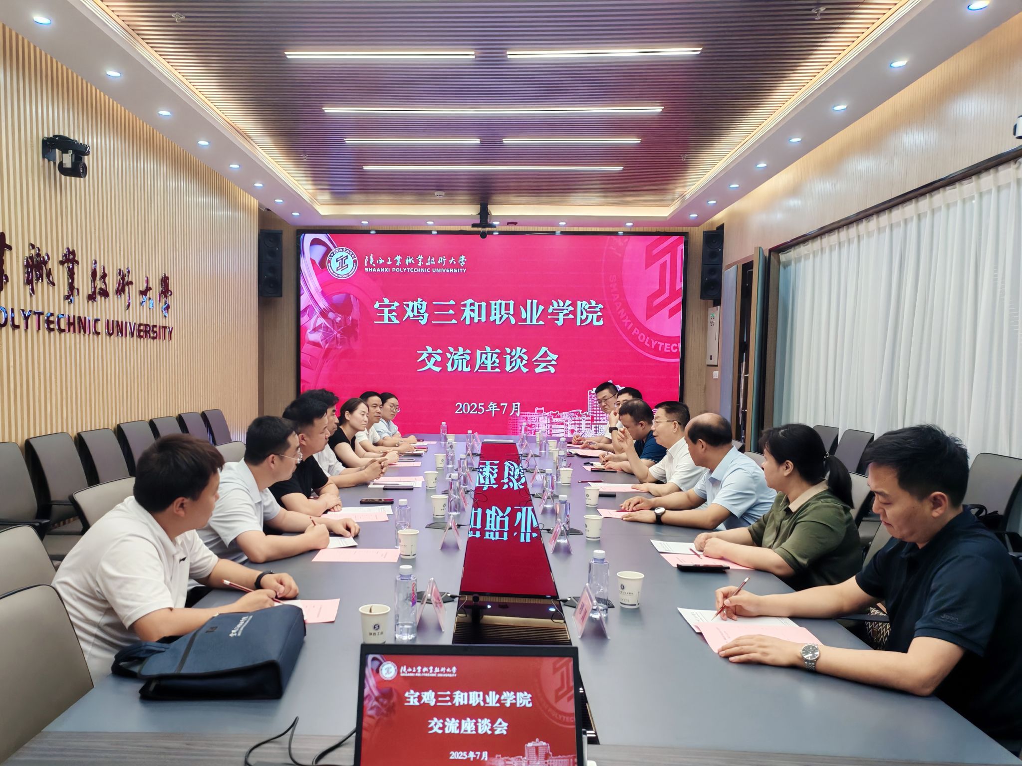 吴毅对我校先进的办学理念和取得的显著成绩表示了高度赞赏,并祝贺我校成功升格为职业本科院校。他简要介绍了宝鸡三和职业学院的发展现状。随后,与会人员就课程思政建设、实训基地建设、“双高”建设、专业建设、教师队伍建设、学生管理等方面进行了深入的交流。