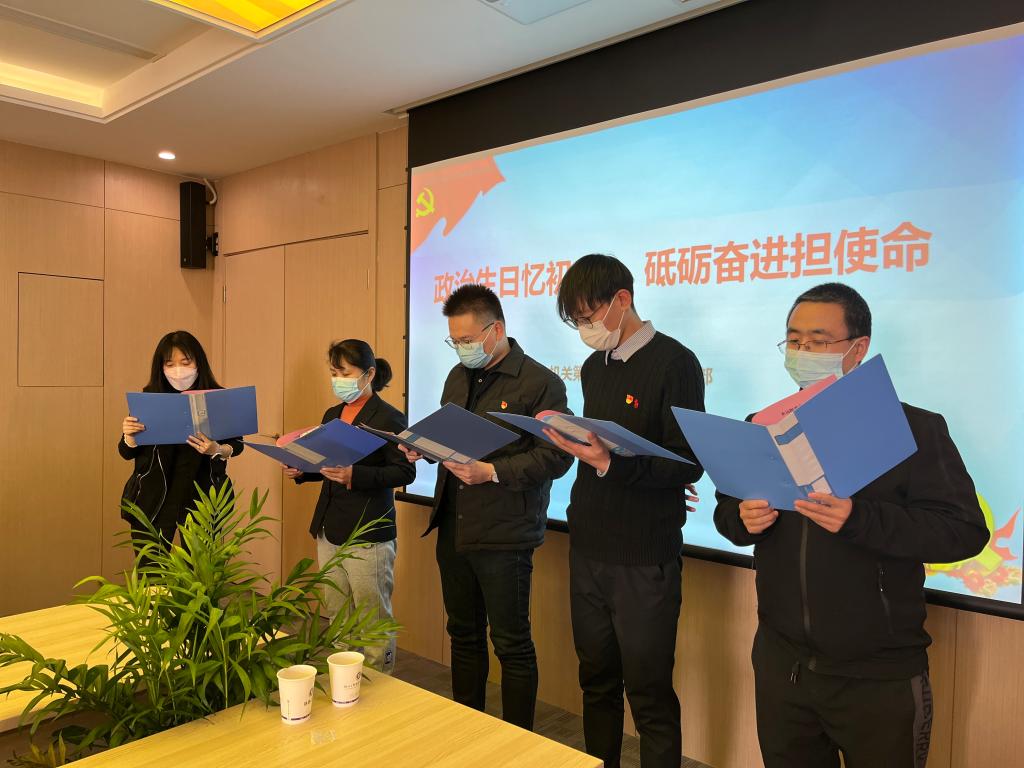 活动中,首先为入党日期为第四季度的六名同志过了一个既严肃又温馨的“政治生日”,支部书记向过“政治生日”的党员同志送上祝福,并代表支部赠送了精心准备的生日贺卡和礼物,使参加“政治生日”的党员们倍感温暖。在支部宣传委员雷琼同志的领誓下,全体党员面向党旗,神情肃穆,高举右手,紧握拳头,重温了入党誓词。过“政治生日”的党员同志朗诵了《永远跟党走》等两首红色诗歌,铮铮誓言,掷地有声,直击内心最初的信仰,使党员同志的心灵再次受到了震撼和洗礼。